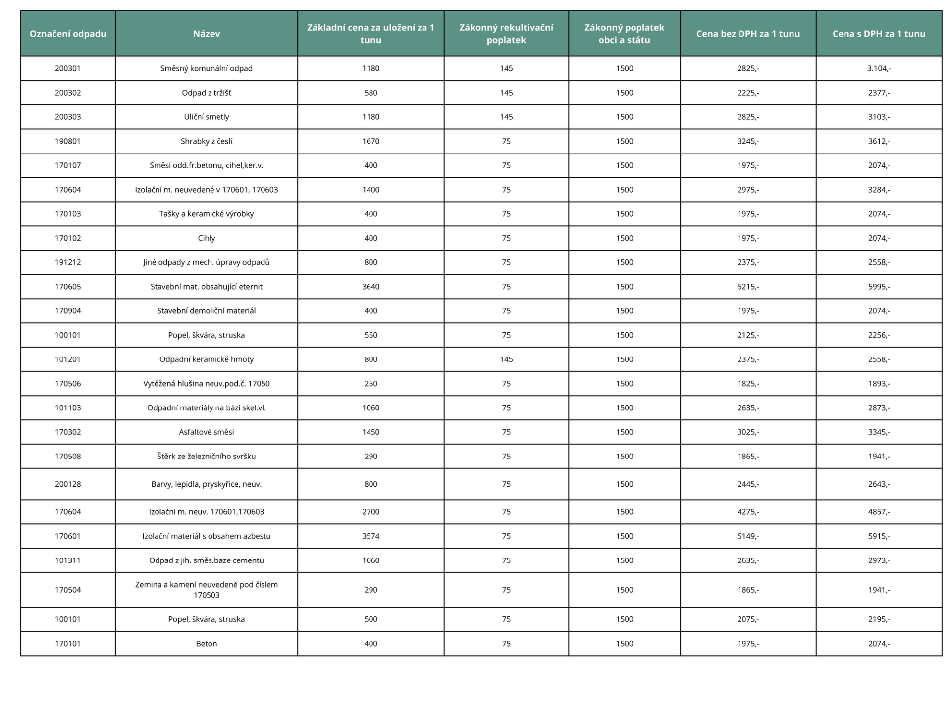 Tento ceník uvádí pouze nejběžnější druhy odpadu. Přijímáme i další odpady, které zde nejsou uvedeny. Pro více informací nás prosím kontaktujte.