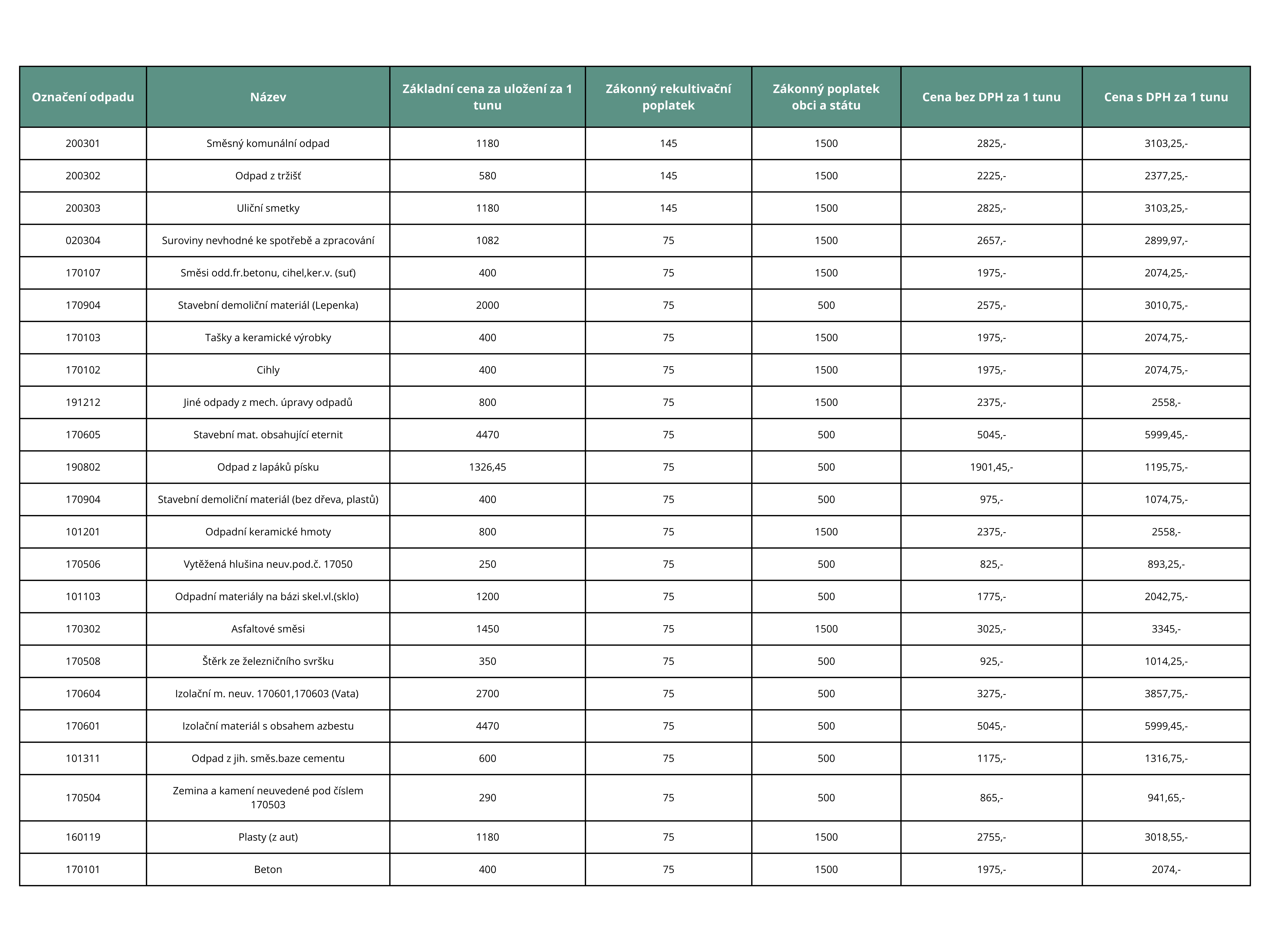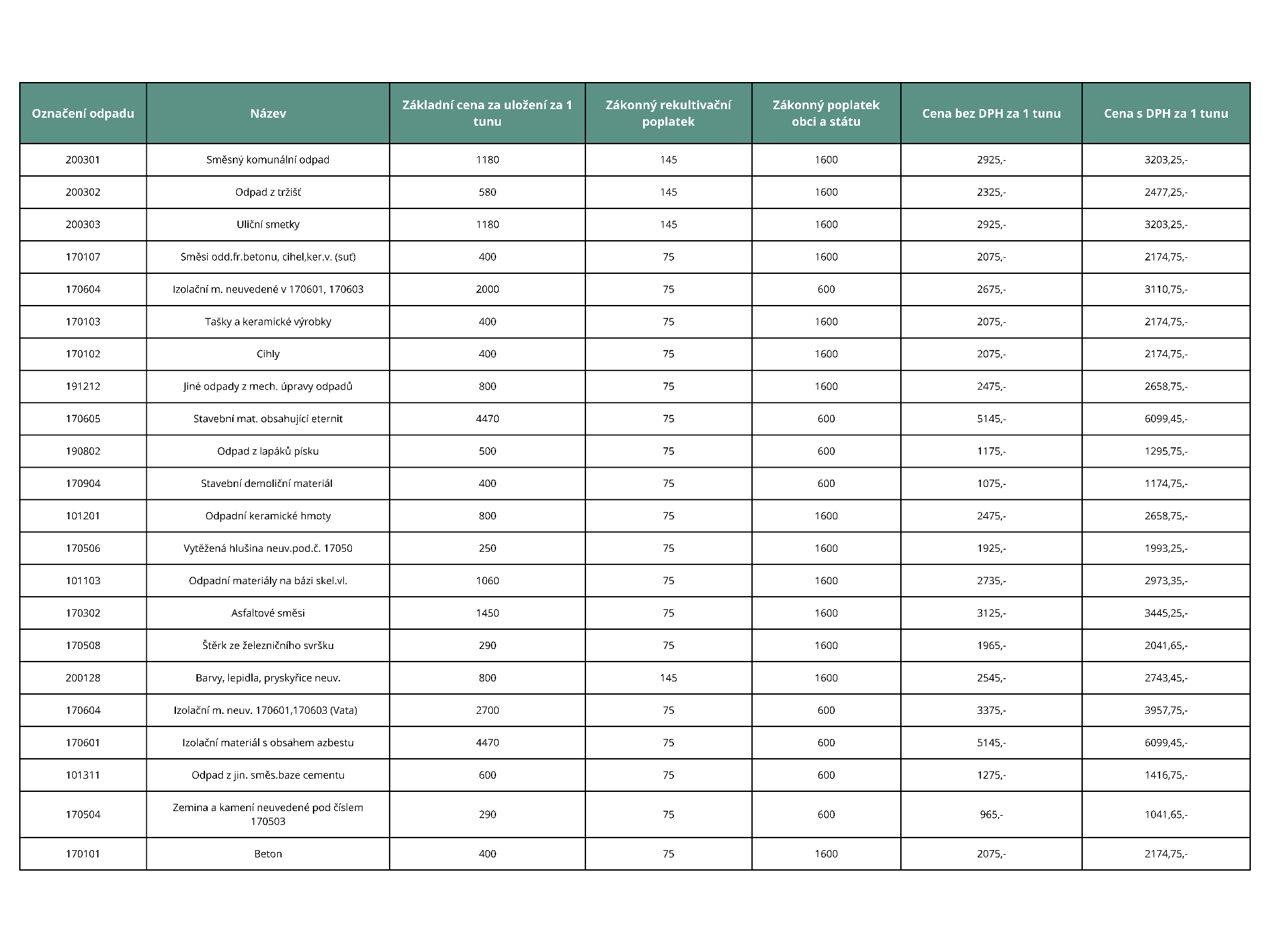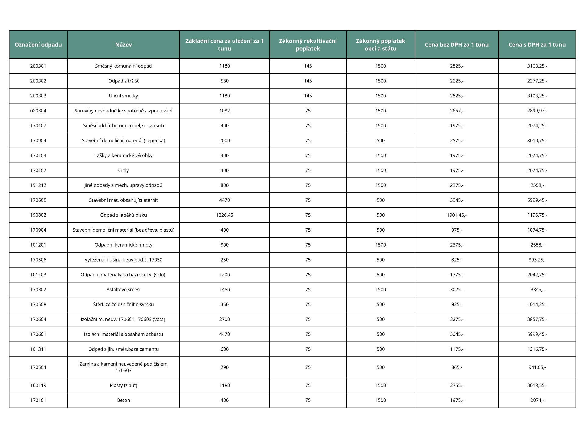 Tento ceník uvádí pouze nejběžnější druhy odpadu. Přijímáme i další odpady, které zde nejsou uvedeny. Pro více informací nás prosím kontaktujte.